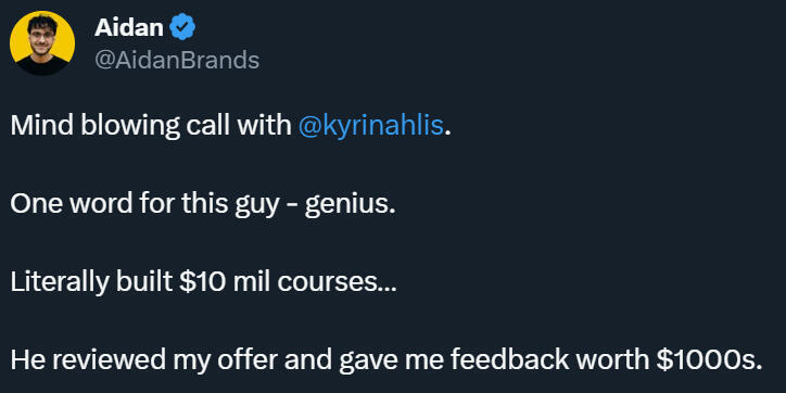 We built our high-ticket community in one call. Kyri gave me the roadmap to scale this to $20-40K/M. We hit ROI in 72 hours of working with Kyri. If you're looking to launch & grow you will thank me when you reach out to Kyri and his team.Francis Nayan "Freedom Through Email"