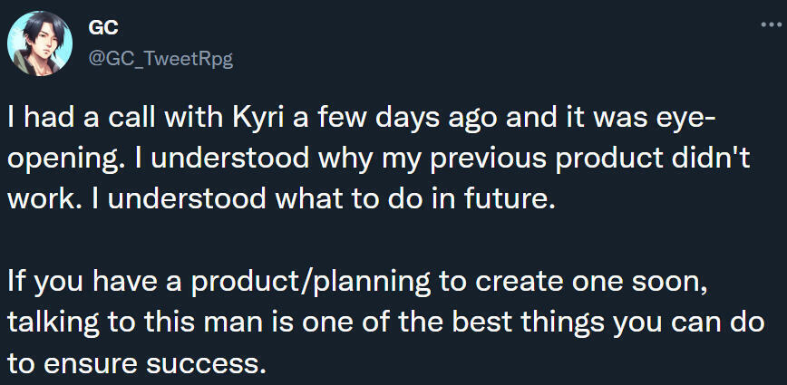 "Working with Kyri has been a game-changer. He transformed my understanding of product development and customer transformation. His concise, actionable guidance led to immediate ROI. Highly recommend!"Habas, ZTH Player Accelerator