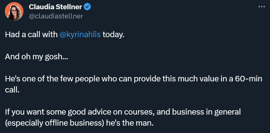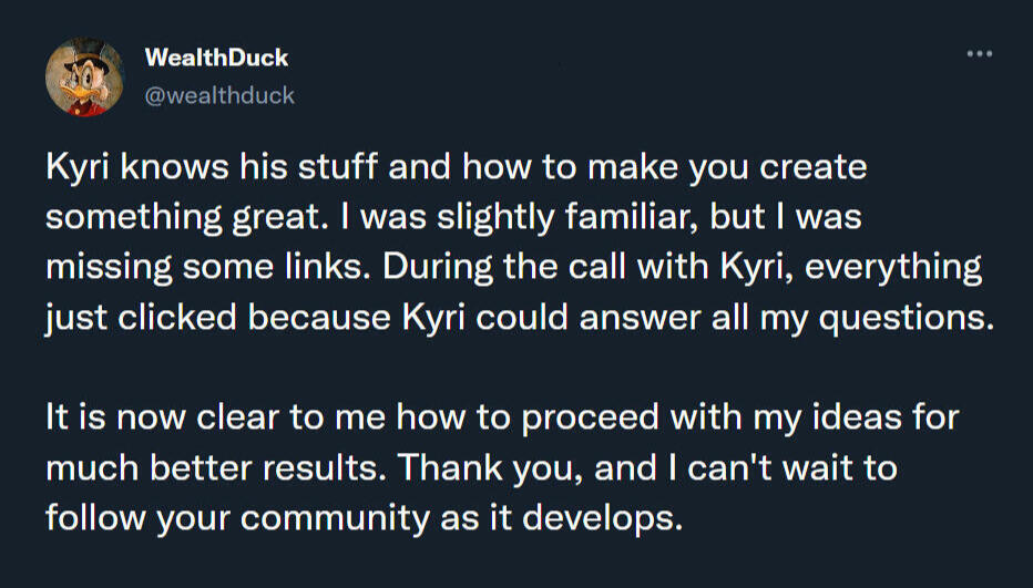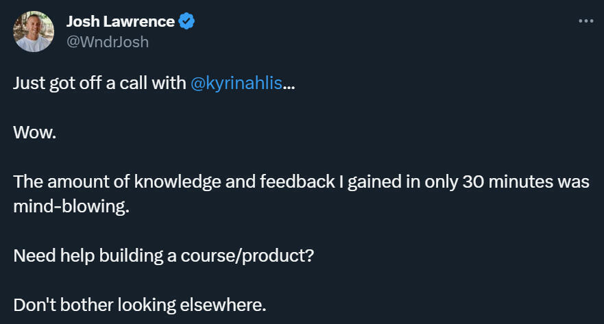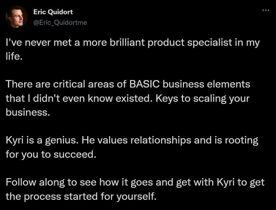 "Before Kyri, I was lost on product development. With Kyri's guidance, we've launched a successful course and community. He provided step-by-step support, SOPs, and even hands-on help. Highly recommend!"Dan West, Online Sales Coach