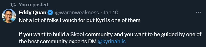 "Kyri helped us build our community from scratch, simplifying everything from effective modules to value communication. He's supportive, proactive, and a continuous asset. Highly recommend working with him!"Brett Erik, Legacy Builder COO