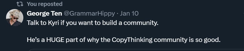 "He’s not just about ideas; he actually builds and manages systems that work. Working with Kyri means I can focus on other aspects of my business."George Ten, 'CopyThinking' Founder
